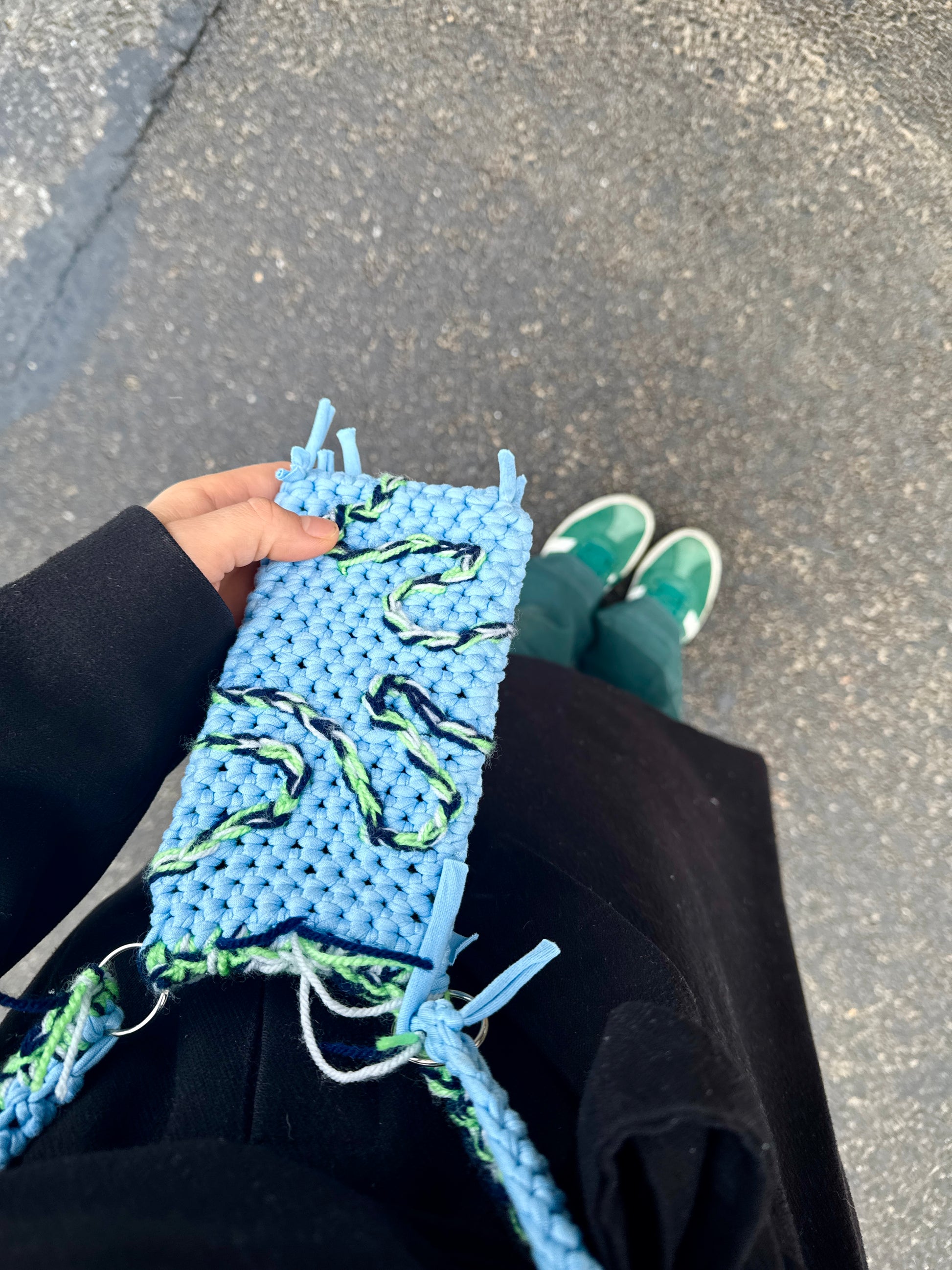 • Broderie crochetée à la main en bleu marine, vert fluo et blanc.
