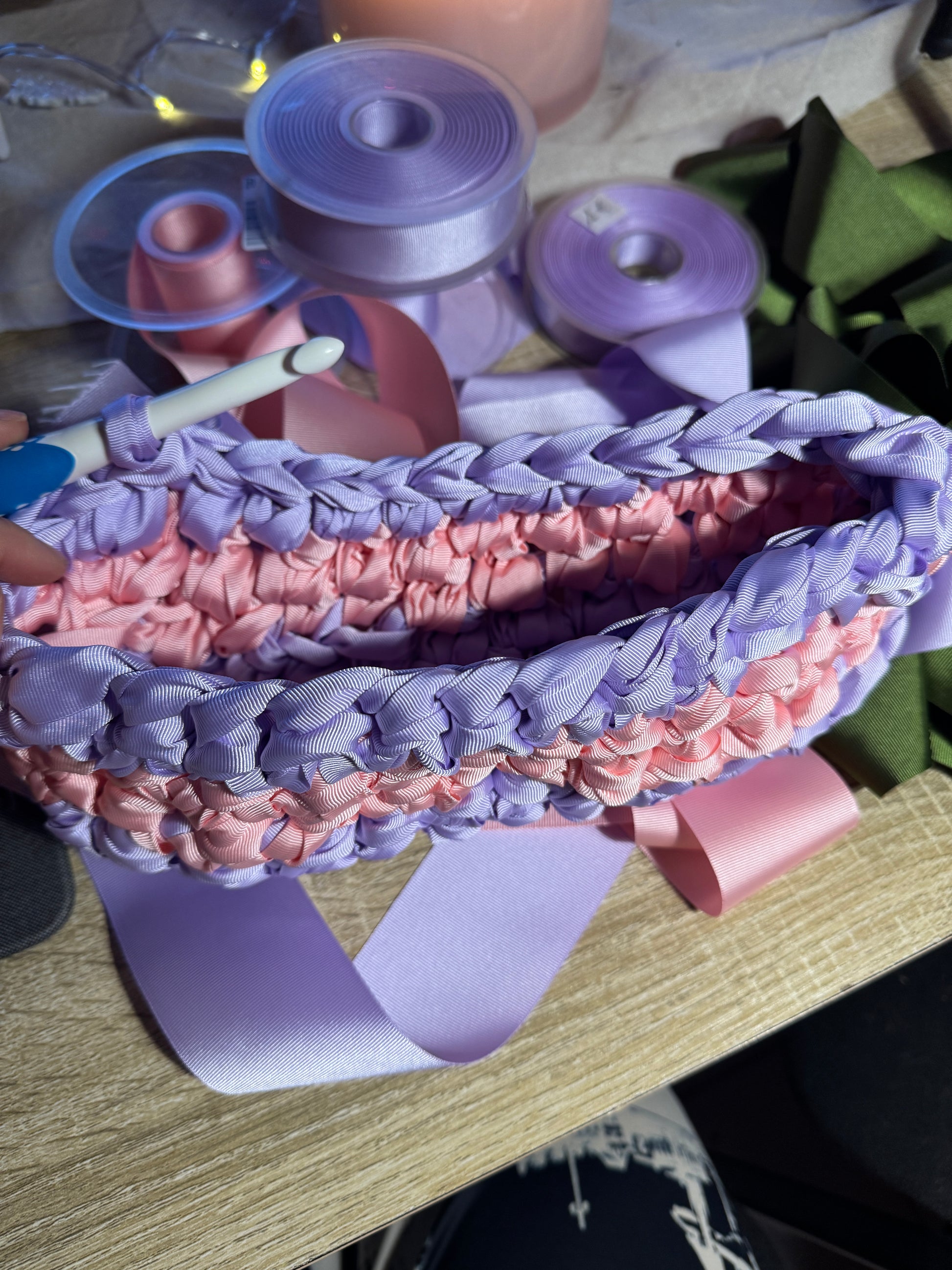 Sac crocheté avec des rubans satinés : violet, rose et vert.